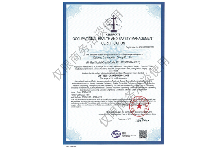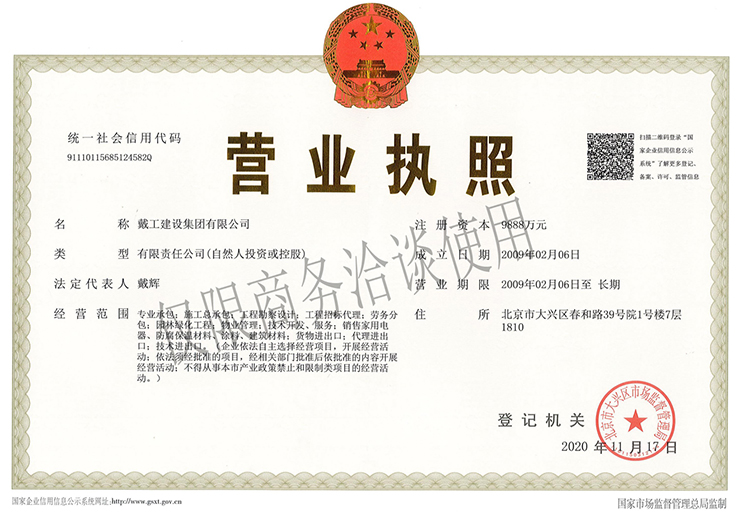 戴工建設集團有限公司,創(chuàng)建于2009年,注冊資本9888萬元人民幣。公司位于北京市大興區(qū)。具有建委頒發(fā)的建筑裝飾裝修專業(yè)壹級,防水保溫工程專業(yè)壹級,建筑幕墻專業(yè)貳級,消防設施專業(yè)貳級,電子與智能化專業(yè)貳級,特種工程(結(jié)構(gòu)補強)專業(yè)不分等級,建筑機電安裝專業(yè)貳級,環(huán)保工程專業(yè)貳級,鋼結(jié)構(gòu)專業(yè)貳級,建筑工程總承包貳級,建筑裝飾工程設計專項甲級,展覽陳列工程設計與施工壹級,展覽展示工程壹級...更多>>